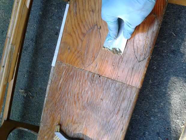 Quitó la vieja capa de uretano impermeable con un solvente químico. Luego, raspar el uretano restante con una espátula de enmasillar y lijar el marco para garantizar que todos los de la vieja capa fue quitado. Luego pintado en tres capas de tinte de madera uretano y rociar sobre una capa adicional de uretano para mayor resistencia. Me puse una mascarilla y guantes de nitrilo y lijado y la aplicación de la mancha y el uretano en el marco.
