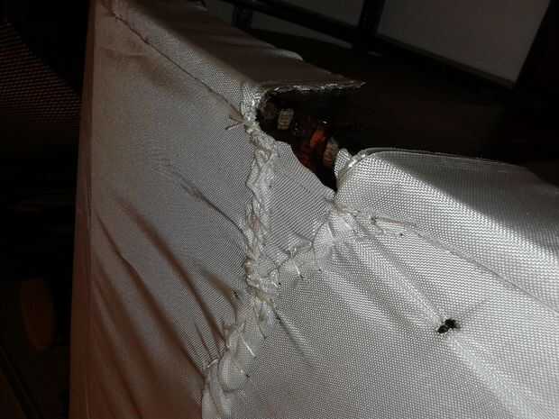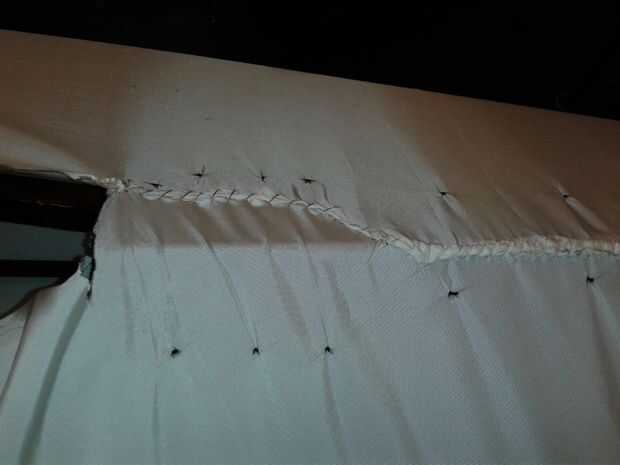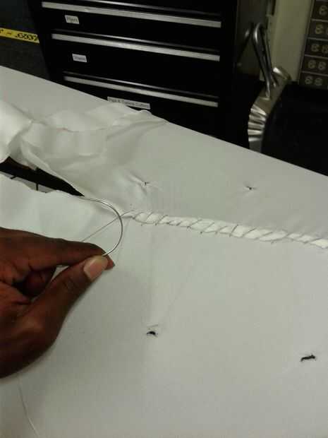 Usando la puntada del azote de la anterior con el pequeño hilo y aguja curvada, coser los lados del barco para quitar la tensión de la cuerda. Asegúrate de tensar el hilo entre las puntadas. Esto debe tirar la tela enseñó, lo que es casi tan estrecha como un tambor. Yo no tenía suficiente tela para cubrir totalmente mi barco, así que tuve que hacer unos parches de tela recortada. Estos parches se cosen en con un punto de Cruz.