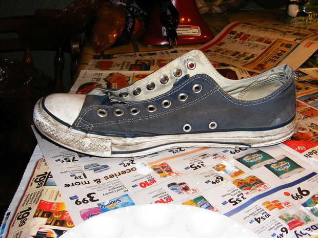 Ahora tenemos que limpiar los zapatos viejos. Si tienes cualquier suciedad en los zapatos, será bola encima cuando tratas de pintar sobre ella y tendrás que utilizar más pintura para intentar cubrir para arriba. Sólo usé algunos 409 para limpiar las partes donde el caucho es. Si sus zapatos son realmente sucias, recomiendo tirar en la lavadora, sin cordones *, sólo para que la pintura no absorbe toda la suciedad en la tela cuando intenta pintarlos.