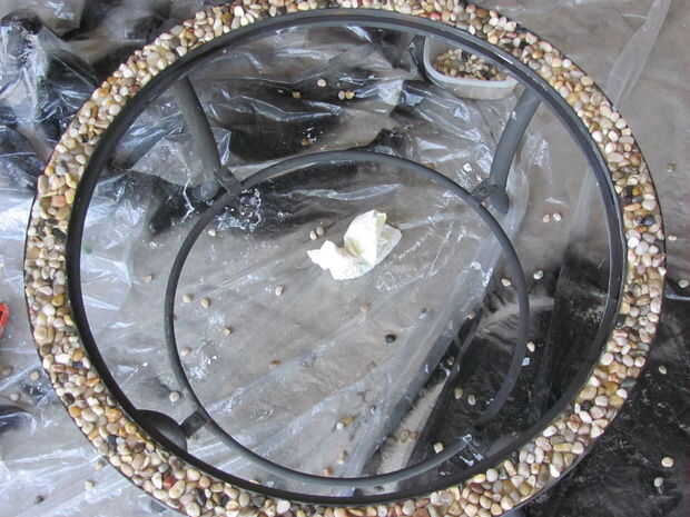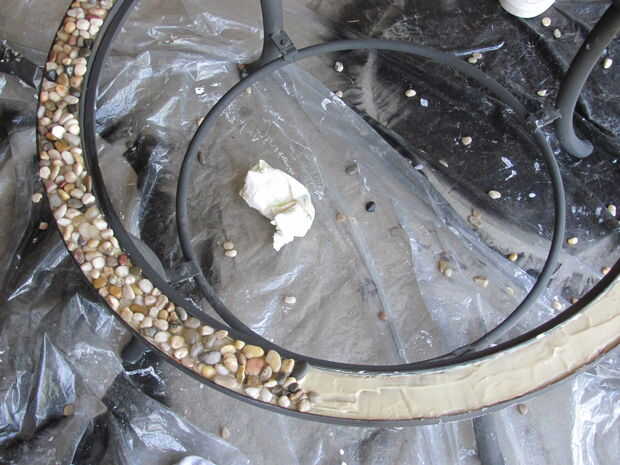 Cuando se tiene una capa de pegamento subir una thinrd a uno la mitad de mayo hasta las paredes del anillo, comience presionando las rocas en el pegamento. Ello, tomando un puñado de rocas y colocarlos en la cola, todo el camino alrededor del anillo. Luego, volver atrás y rellenar los agujeros con piedras más pequeñas. Después de todas las rocas en su lugar, pulsa la mano hacia abajo a lo largo de la parte superior de las rocas.