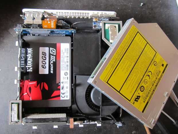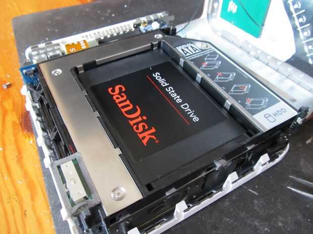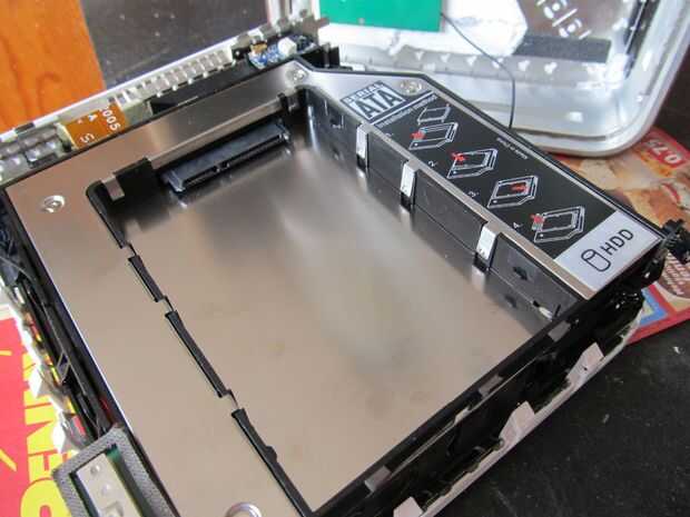 Reemplacé el HDD por un SSD de 60 GB. Para la impulsión de TimeMachine estoy usando un SSD de 120 GB. Para ejecutar una unidad SATA en lugar de un IDE unidad óptica es necesario utilizar instalar un convertidor que convierte la interfaz IDE a SATA. Este convertidor está disponible en internet. Es fácil de instalar y funciona sin ningún driver. A veces es necesario formatear el disco primero en un caso USB.