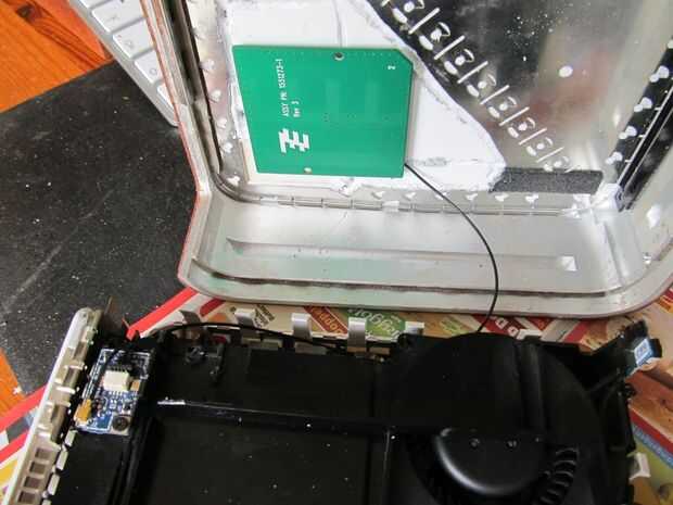 La antena WLAN interna es una poco la semana. Así que decidí instalar una antena mejor. He quitado una parte de la pantalla y colocar la antena en la tapa.
