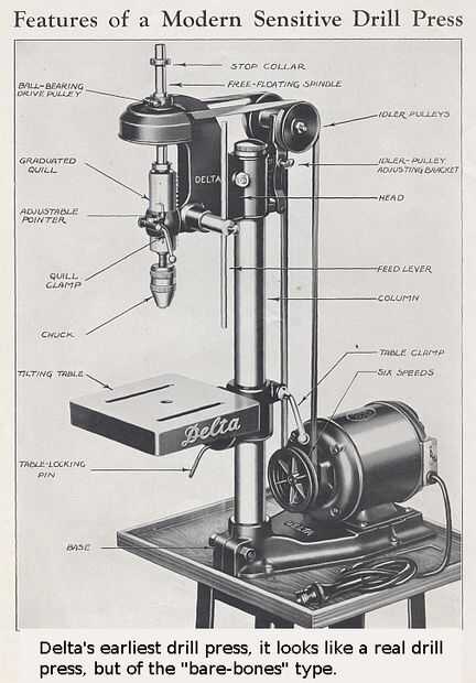 La segunda imagen muestra el arreglo general del taladro estándar a partir de 1931. Algunos tienen partes mucho más que la mía, pero las principales áreas de interés son la condición y la exactitud de la base, el pilar principal (columna), la mesa, el huso, la pluma y el mandril.