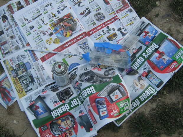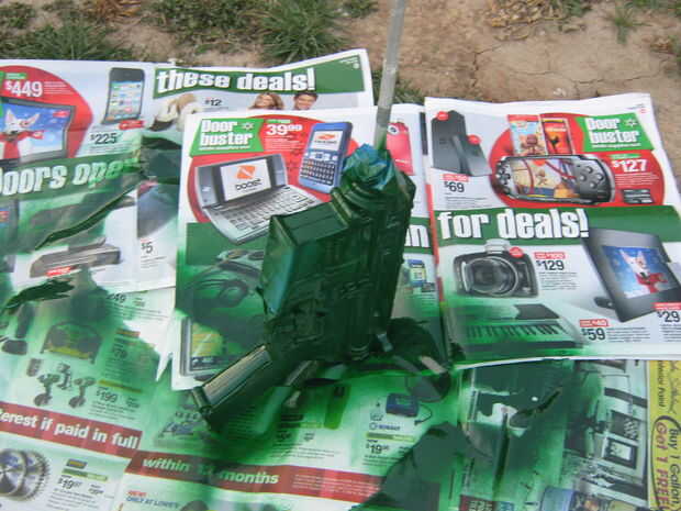 Utilicé el cuchillo para trocear los pintores cinta personalizada que cubra las aberturas, no conseguiría asegurar pintura dentro del mecanismo. Aplicado la cinta, tomó la pistola fuera y aplicadas dos capas de un "verde de hombre del ejército".