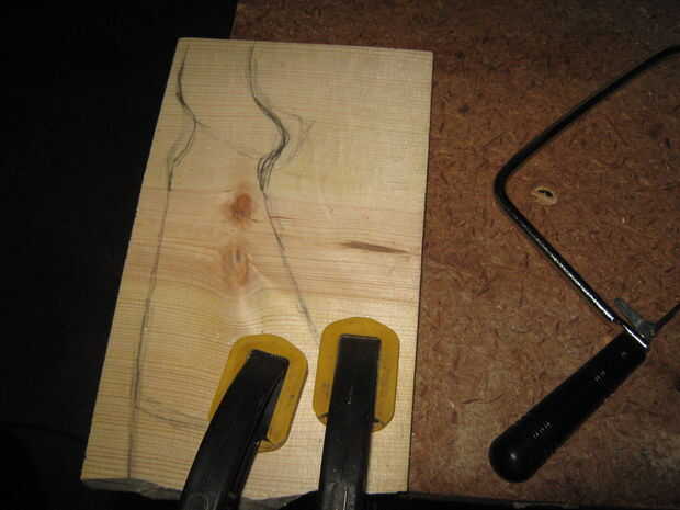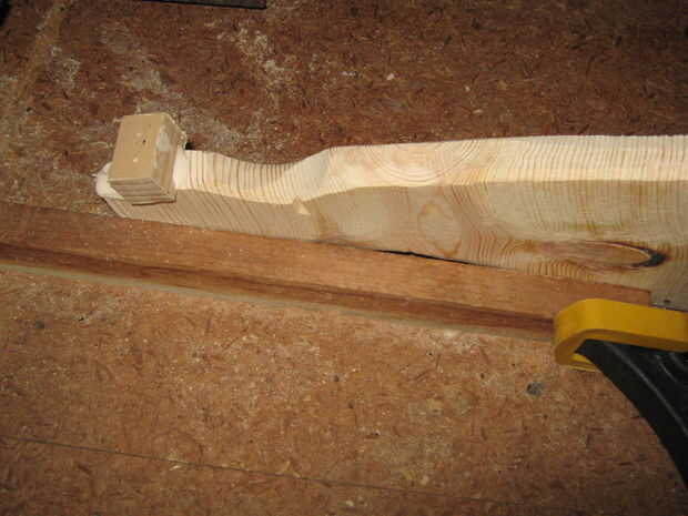 Tomé entonces una hoja de 1/2 pulgada de madera que haría un bonito trasero por longitud del brazo de mi, esto es personalizable. Redacté una acción basada en la fotografía en el primer paso (I libre el diseño así que lo siento hay es no imprimir). Una vez dibujado, cortar la bolsa usando una sierra de calar y lijar los bordes lisos con la lijadora de banda. Hice un pequeño bloque para que el tope podría ser pegado a la carcasa. Hice esto por pegar el bloque pequeño para la población y un pequeño orificio en la culata y el bloque de perforación - luego usé un fastner' para fijarlo (esto es difícil de explicar, así que mira las fotos más abajo).
