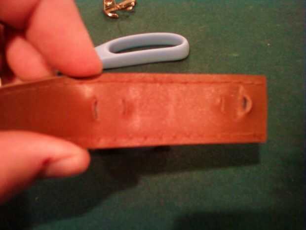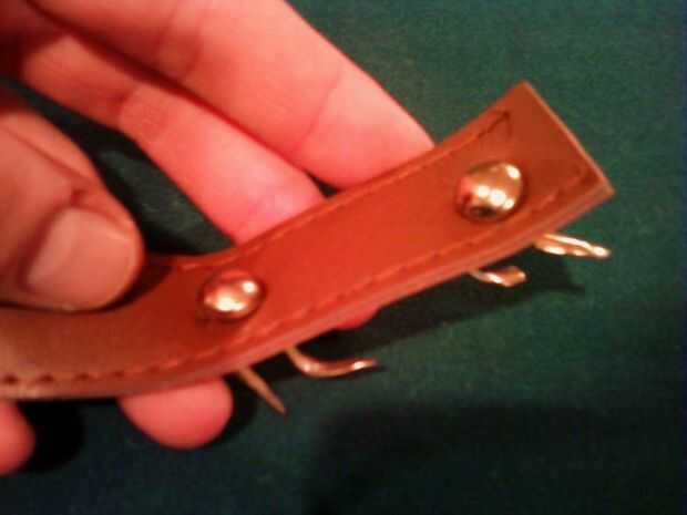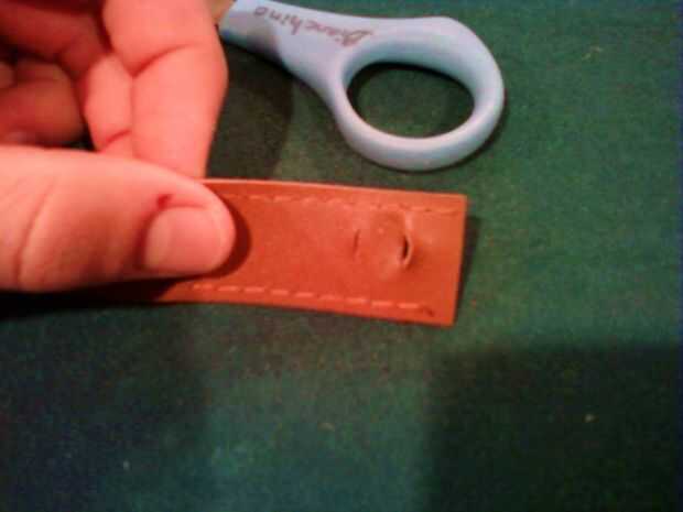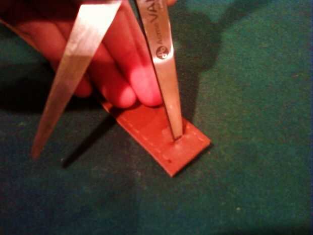 un) aproximadamente 1/2" del borde hacen una abertura lo suficientemente grande para las"patas"del sujetador de latón para caber a través, entonces unos 3/8" (hacia el extremo opuesto de la pieza) de esa raja raja otro.