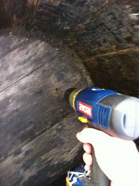 Así que determiné que necesitaba al menos cuidar de la cuestión del agua inmediatamente. Tomé mi fiel taladro y la broca más grande que pude encontrar en mi desorden de una caja de herramientas. Luego puse cuatro orificios en la parte inferior de la maceta y que los orificios de drenaje existentes eran claros.