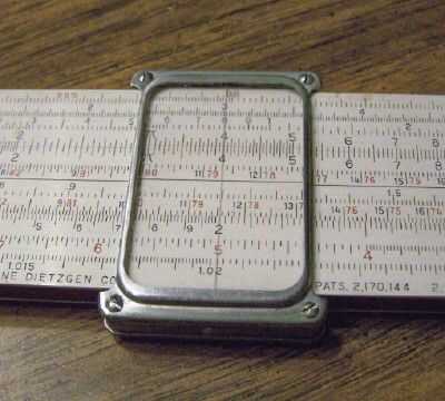 Al final pedazos de cristal y sus líneas se ven muy bien. Esta foto es la parte de la regla que incluye el A, B, no C, D, y K. La línea del cabello se encuentra en el número 4 en la mitad izquierda de las escalas A y B. Siga la línea del cabello hacia abajo y se puede ver que la línea del cabello es también más de 2 en la escala de D, que indica la raíz cuadrada de 4. (Las escalas A y B se utilizan en combinación con las escalas C y D de cuadrados y raíces cuadradas. La escala K es para cubos y raíces cúbicas).