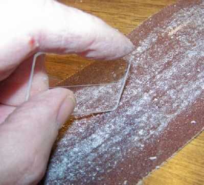 Redondear las esquinas tirando a lo largo de la lija al oscilar el extremo opuesto del plexiglás hacia arriba. Compruebe a menudo contra el retenedor del vidrio para el ajuste.