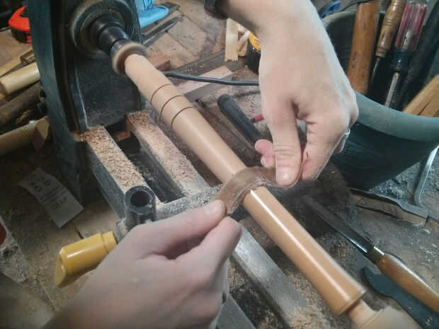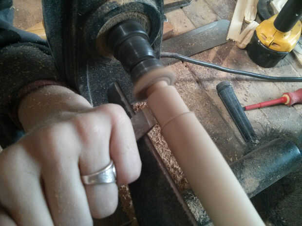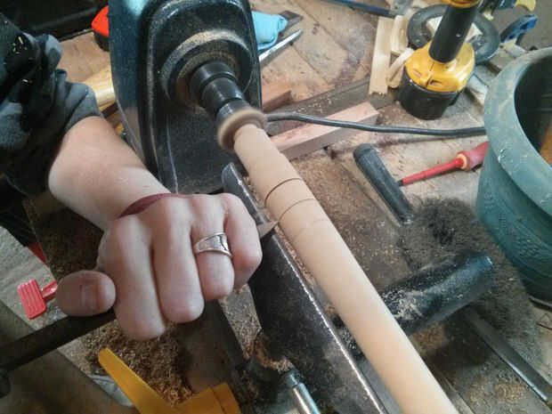 Para pulir, hacer girar el torno a baja velocidad y utilice un pedazo de lienzo, con el pulimento, pasar por encima de su longitud. Empezará a brillar como el calor de fricción lo incrusta en la madera.