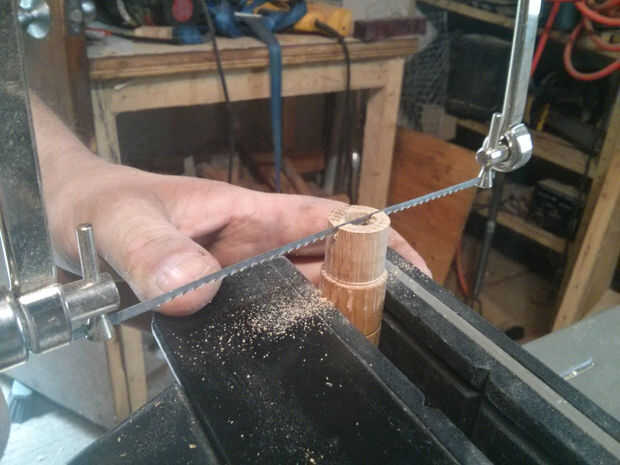 Cuando se perfora su agujero, use su sierra de marquetería para cortar una ranura, para separar el asiento de su férula en dos piezas. Como se mencionó antes, no utilizaremos pegamento por lo que la adición de la virola, literalmente, sujetar el mandril en su lugar, más firmemente que si había utilizado pegamento.
