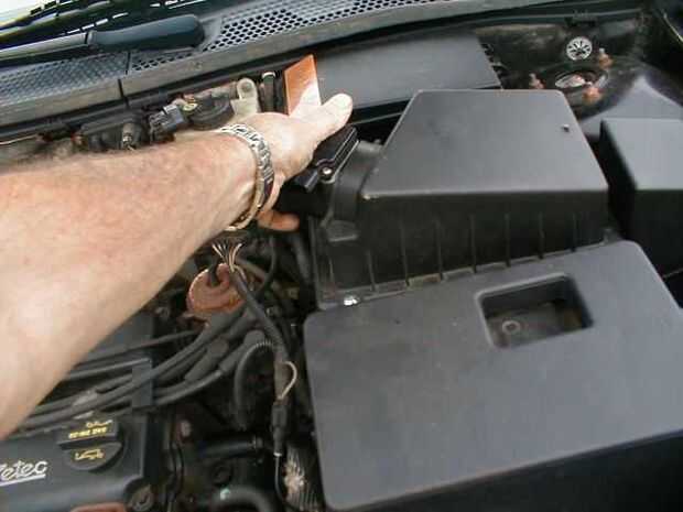 Agarre el aire limpiador y sáquela hacia fuera, (podría sólo mostrar una mano ya que necesitaba el otro para tomar la fotografía) una mano en cada extremo, puede ser necesario darle un tirón leve como establece en 3 arandelas de goma.