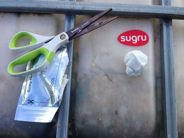 Trabajamos algunos SUGRU por unos momentos hasta que era suave y maleable y usa para conectar toda la zona que rodea la grieta. Hemos sido generosos con el SUGRU, teniendo en cuenta que la presión que 1000l de agua ejercerá sobre la reparación una vez terminada.