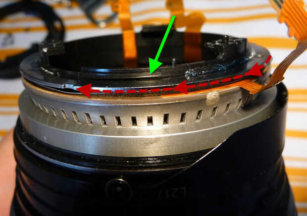 Gire el anillo de acero como se indica para aumentar la presión sobre la arandela de la onda y todo el conjunto de AF/MF. Usted no necesitará convertirlo completamente en la culata en t, para realizar pruebas para ver si tienes suficiente presión por reemplazar el anillo MF y comprobar si resulta del mecanismo de enfoque. Volver a aplicar algunos calidad loctite o superglue medio. Utilicé un palillo de dientes para aplicar el pegamento. No necesita mucho, como lo está haciendo es detener anillo th acero de desenroscar.