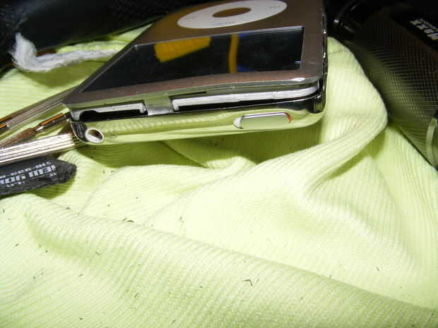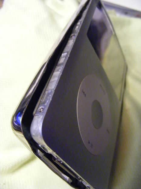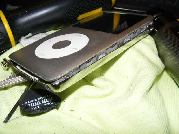 ADVERTENCIA: Uso de instrumentos afilados puede causar lesiones cuando se desliza la herramienta. Use una toalla para guardar el ipod resbaladizo y proteger los dedos y venas/arterias. Tenga cuidado de no rasguñar o romper la pantalla y nada dentro es frágil.