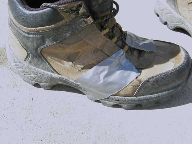 Así que decidí probar el pegamento gorila de todos modos. Según las instrucciones, me mojé mis botas y aplica una fina capa para cubrir las grietas y agujeros. Entonces tomé alguna cinta adhesiva para sostenerlo en lugar. Lo dejé secar durante varias horas.
