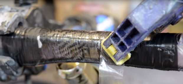 Usa cinta de compresión, envolver firmemente alrededor de la zona de reparación. Sujete el extremo de la cinta usando una utilidad o al marco de la abrazadera del resorte para sostener la cinta segura. Asegúrese de que tiene un trapo o toalla en mano para líos. Usando una pistola de calor o secador de pelo, calor la cinta completamente para crear compresión alrededor de la zona de reparación. Cuidado con los sobrecalentamientos y quema a través de la cinta.