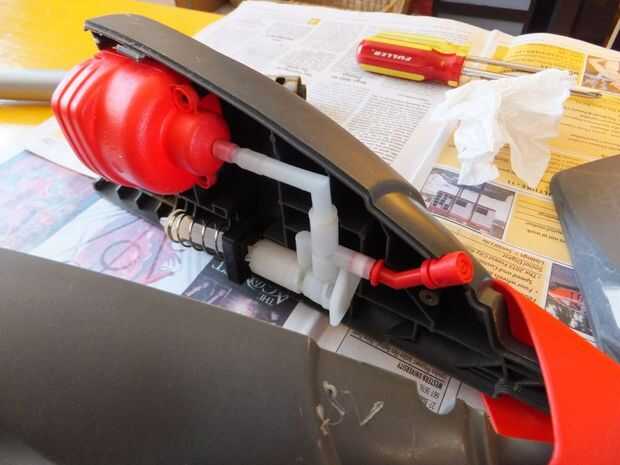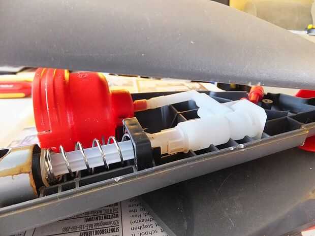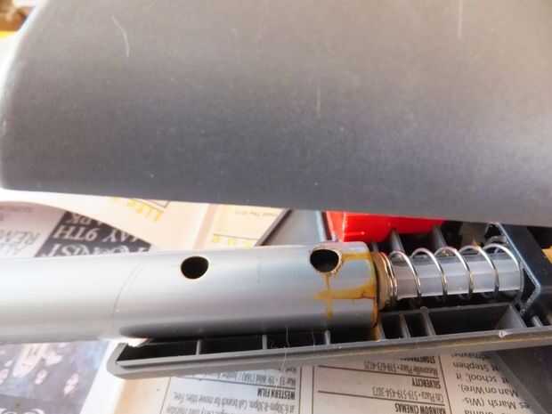 Cuenta en las fotos 2 y 3 de la varilla de la fregona (que conecta el mango con el cuerpo de la bomba). Tiene otra barra interior une a lo pistion/émbolo para hacer que vaya arriba/abajo en el cilindro. Esto debe conectarse correctamente a la parte superior del pistón del émbolo y esté bien asentada en la carcasa de la bomba.