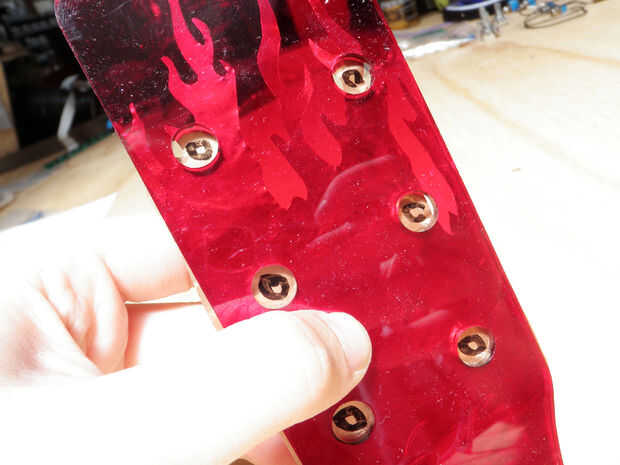 El plan original era montar las llamas cobre encima de acrílico rojo, pero cuando le pongo el cobre detrás el acrílico a círculos traza para los agujeros del corte, me sorprendió gratamente encontrar esta muy estéticamente agradable, así decidió montar las llamas en la parte posterior.