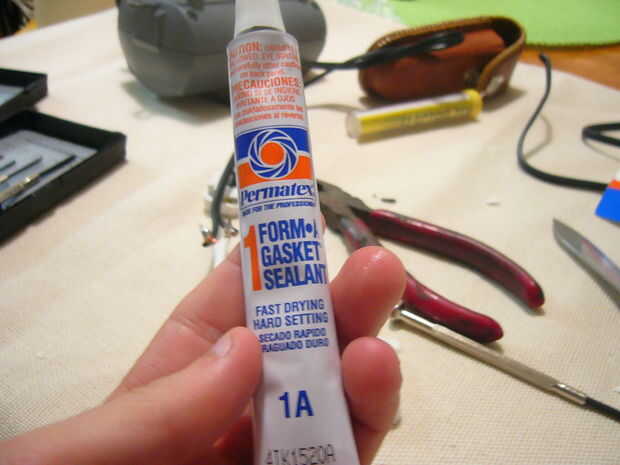 Solución de material de empaque extra líquido. Se trata de un material de fraguado rápido que se seca bastante duro. Goop on y dejar que cure...