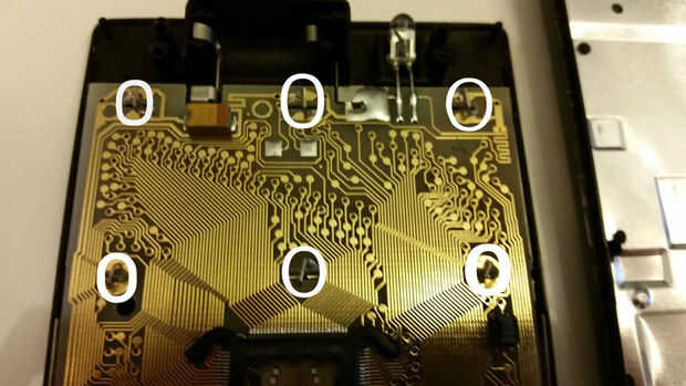Esta foto muestra las pestañas metálicas que sujetan la placa de circuito en la parte delantera la mitad de la caja. En ambos modelos, que yo he reparado, las filas superior e inferior de pestañas fueron torcidas direcciones opuestas. Por lo tanto, sea cuidadoso acerca de qué dirección se tuerza el las pestañas para alinear con las ranuras de la placa de circuito para que no se tuerza apagado.