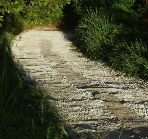 Por desgracia, estoy corriendo fuera de rejilla, así que tuve que hacer dos pistas donde van las ruedas, en lugar de todo el ancho de la carretera. Froto un cemento en la zona centro para rellenar las grietas y retardar crecimiento de malas hierbas.