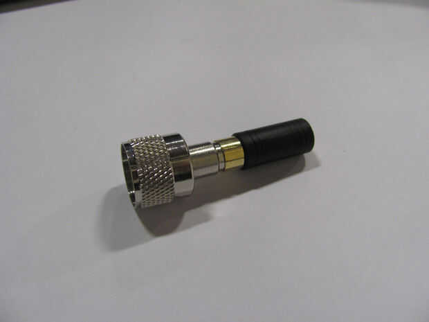Resulta un Amphenol 2501F tiene el mismo diámetro y rosca como un conector de antena PL259. El PL259 tiene un pin de centro más largo, pero que es fácilmente cortado y alisado con un toque de soldadura. En la foto los 2 conectores de la izquierda en la foto son 2501F y 2 a la derecha son PL259 de cortar y soldar para que sean un sustituto funcional. Esto funciona pero tiene un inconveniente. El PL259 era un conector de antena. Fue hecho en o prensar el apantallador de la antena. No hay ningún lugar adecuado para soldar el alambre de retorno para usar para un auricular. El 2501F tiene un resorte y un tornillo para sujetar el cable de retorno. He perforado un agujero pequeño en el extremo de un PL259 adaptador o envuelto un resorte alrededor del extremo para hacer la conexión, pero hay una solución mucho más simple.