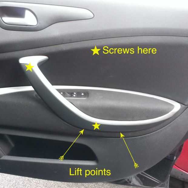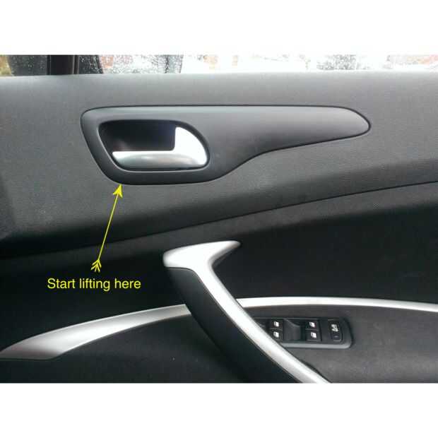 2. a continuación retirar el guarnecido de la manija de la puerta, empezar a levantar con un destornillador en los puntos indicados en el cuadro. Usted ahora tiene acceso a los 2 tornillos torx, retirarlos.