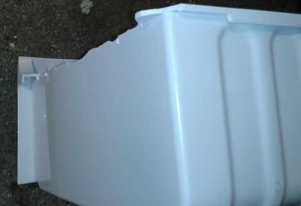 Aquí es el daño.  Los ángulos de plástico que se ejecutan en las ranuras de la moldura interior del congelador han roto lejos.  Esto deja un cajón sobre el contenido de la una, muy torpe, pero me parece una lástima perder el congelador todo o pagar el dinero para otro va a ser apenas tan frágil...