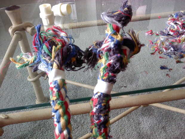 Siguiente es preparar los extremos de la percha de la cuerda por lo que podemos pegarlos en los conectores.  Tome la cinta * y cortar una tira que es aproximadamente 1/2" ancho y largo para ir alrededor de la percha dos veces.  Luego envuélvalo alrededor del extremo dañado, justo debajo de donde la perca comienza a deshilacharse.  Esta parte de la percha debe estar agradable y firmemente torcidos juntos, no suelto y deshilachada.  La razón por la que envuelva la posa aquí es que cuando usted corta los extremos deshilachados, la cinta de la perca de desgaste adicional una vez que se cortan los extremos.  También hace más fácil caber en el conector y evita los extremos electro hacia fuera cuando se empujó en el cuplé.