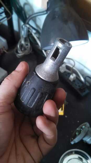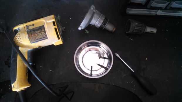 El interior de la carcasa frontal con con dos "dientes" las placas cuando presiona a participar el destornillador. Hay un resorte y un émbolo que mantiene las placas dentadas, que la primavera fue afectada con la suciedad y la mugre que no estaba haciendo su trabajo. Así que limpiar piezas con desengrasante y un cepillo/trapo, demostrada que no había realmente ninguna parte rota o que falta. Excepto para la extensión de soporte Taladro broca. (parte más fácil).