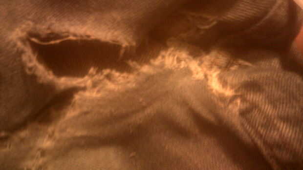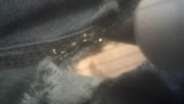 Para agujeros grandes es mejor trabajar en partes, un poco de pegamento y presione la costura de la tela sobre la lágrima expuesta. Aquí es donde me fui hacia los lados, comencé a presionar a la tela sobre la costura en lugar de la costura en la tela. Dejando un antiestético pero todavía eficaz de reparación.