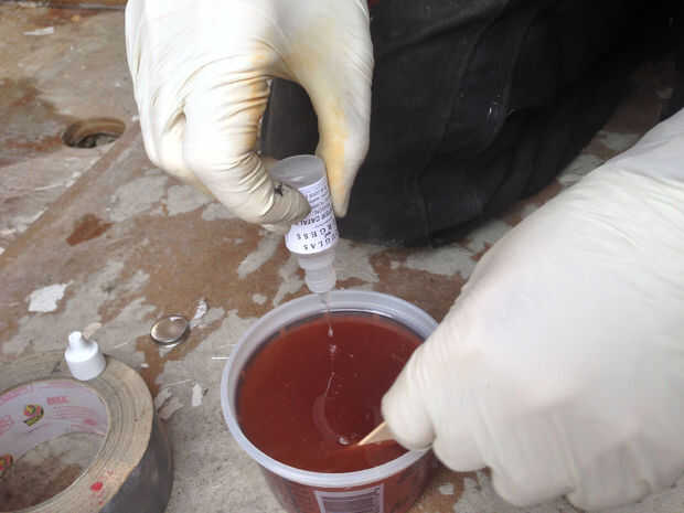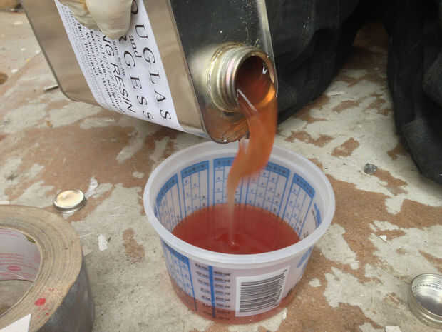 Si hace frío, o si usted está haciendo capas delgadas de resina, necesitará usar más catalizador que recomienda. A menudo los fabricantes de resina lista cuánto catalizador es necesario por el volumen de la resina en el recipiente. En este caso, utilicé 1/4 de onza de catalizador a la resina de 1/2 QT. Y luego muchas gotas extras para la buena medida, ya que hacía frío y que sólo estaba haciendo una capa delgada.