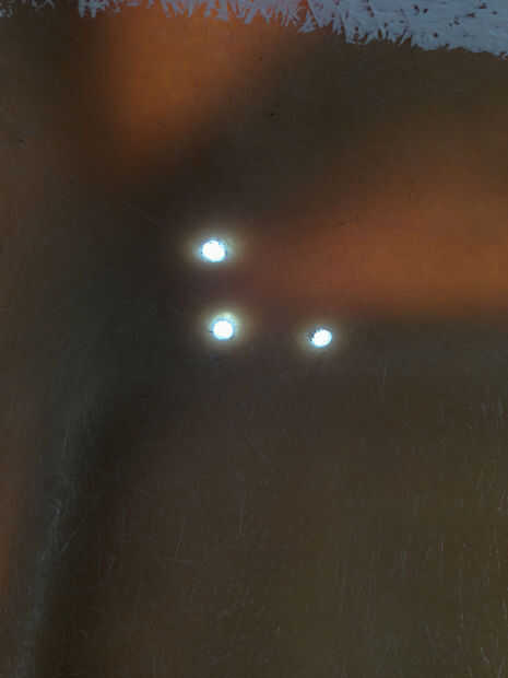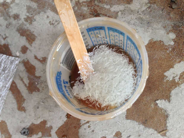 Había perforado unos agujeros pequeños para algunos pernos en U se hunden en ellos el año pasado, pero deseo un inicio limpio, he decidido estos parches también. Con la resina catalizada restantes que no uso para los parches - mezclé en algunas de la escama de picado de fibra de vidrio. Después de que fue bien mezclado, respaldados por todos los agujeros con cinta adhesiva y luego comenzó a fil con escamas de fibra y sellado con un parche de hoja pequeña sola en fibra de vidrio.
