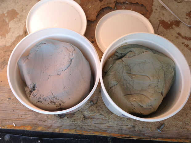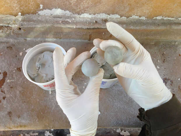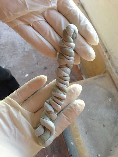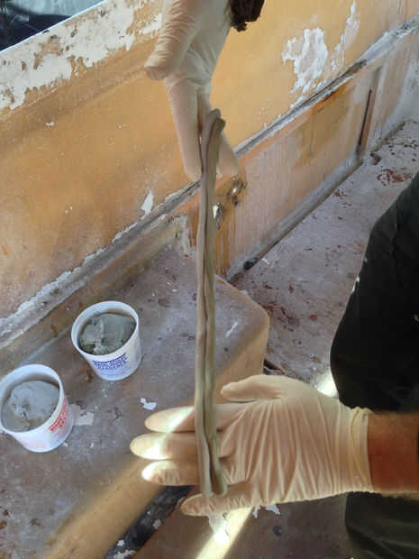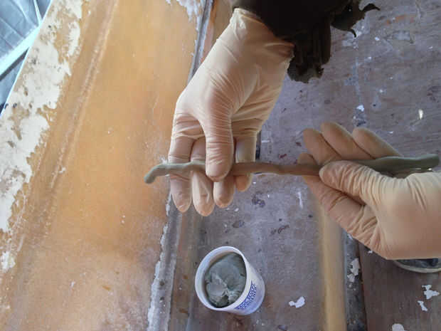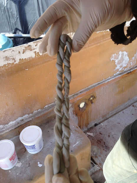 Esto es cuando la Magic Sculpt entra en juego, lo usamos como usted utilizaría un relleno de madera en un agujero en la madera. Es una arcilla de 2 partes que hay que mezclar bien durante unos minutos trabajar con eficacia. Hicimos 2 cuerdas largas, luego los trenzados entre sí, entonces esa cuerda torcida y mantuvo torciendo hasta que fue más como mezcla y aplastar.