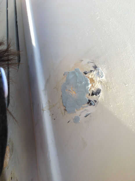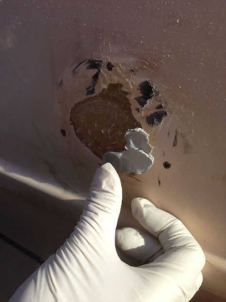 La masilla se utiliza para rellenar unos hoyos no incluso en el gelcoat de la fibra de vidrio de los parches ásperos que habíamos hecho.