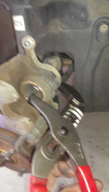 Coloque la pinza en el soporte y antes de empujar el pistón hacia atrás, retirar algún líquido de frenos del depósito, utilicé un purgador de freno neumático. Apriete el pistón hacia atrás teniendo cuidado de no dañar el fuelle de goma, usted puede comprar herramientas especializadas para esto pero simplemente estoy usando un par de apretones varios grandes. Después el pistón en Baje la pinza y apretar el tornillo!