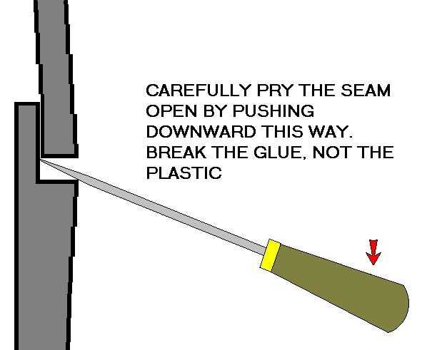 A partir de la mitad de cada lado, con cuidado haga palanca en el ángulo que se muestra mientras aplica presión hacia adentro (no tienen la palanca herramienta frente a cualquier parte de su cuerpo). Tendrá que cavar un poco, pero finalmente aparecerá. Trabajar de izquierda a derecha a lo largo del mismo lado, luego hacer el otro y luego los lados más estrechos. Una vez que han comprometido el sello en los cuatro lados, con cuidado trabajan en las esquinas hasta que puede empezar a husmear las mitades separadas. La idea es tratar de trabajar la herramienta de palanca a través de la Junta y luego en la parte superior del labio para empezar a trabajar las mitades separadas.