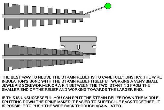 Si a pesar de sus esfuerzos se puede separar el cable del alivio de tensión, puede cortar en él con una navaja como se muestra. Intente cortar a lo largo de una columna donde puede tener la posibilidad de pegarla detrás juntos otra vez. Si es posible, a partir del extremo primero y es posible que pueda evitar algún trabajo extra.