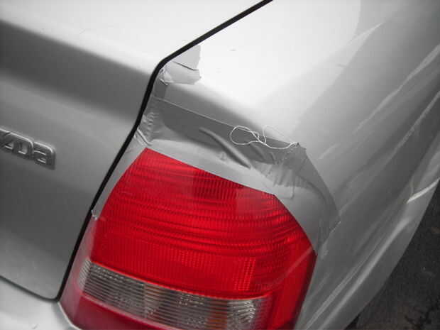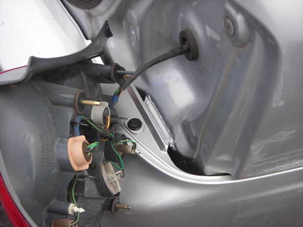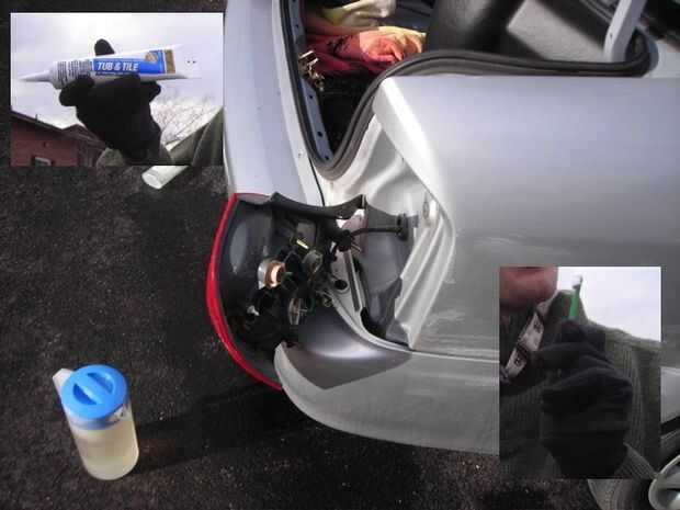Se supone que deja la masilla seca de un par de horas a un día (dependiendo de lo que compraste). Porque mi coche está estacionado en un aparcamiento al aire libre, no dejo cosas como eso. Por lo tanto, volver a montar la luz de fondo, y para asegurarse de que cosas se quedaría seco, de conductos con cinta para evitar que el agua penetre en la masilla.