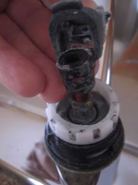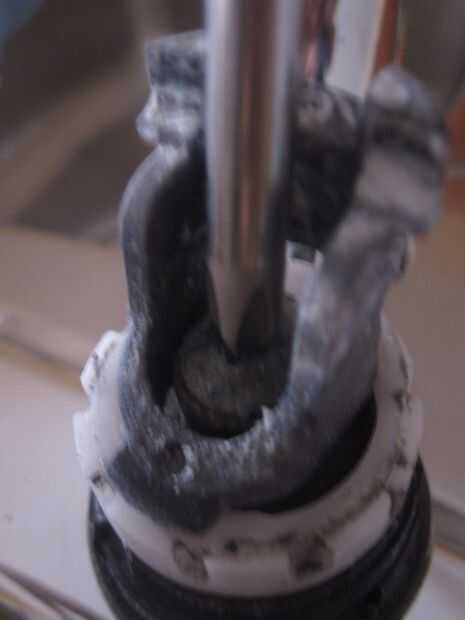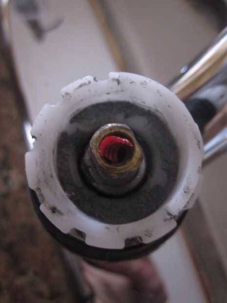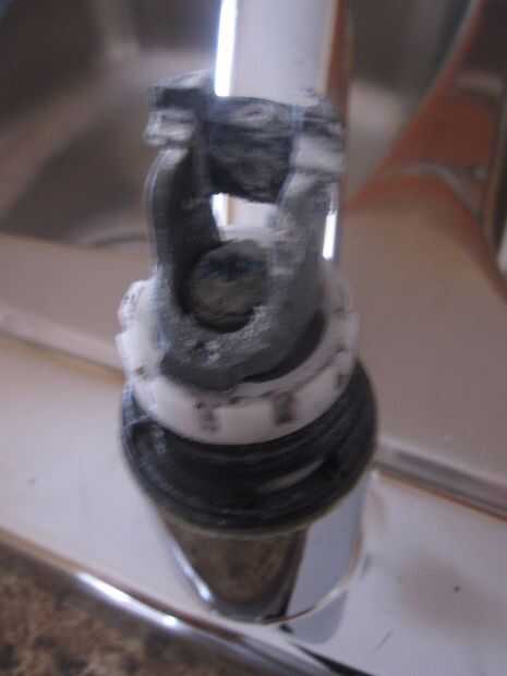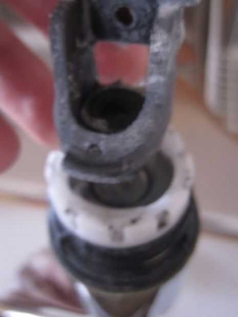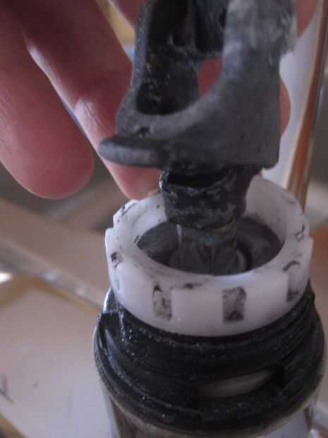 Ese clip de plástico negro (envuelto alrededor del mecanismo de la manija del metal) que se enrosca en el tallo de color cobre subyacente (que es parte del cartucho) sólo caben 2 posibilidades porque hay caras "planas" en la espiga de cobre. No es realmente qué camino va en, pero usted debe Asegúrese de que el plástico es completamente hacia abajo y cómodamente sobre la espiga de cobre.