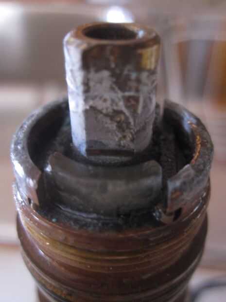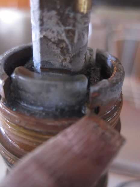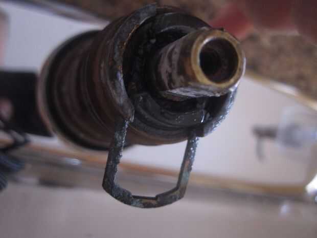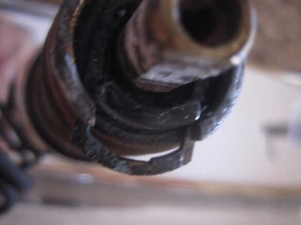 Ahora nos va ser quitar el surtidor y el clip que sujeta en el cartucho. Sólo debe deslizar el surtidor, como se puede ver en las fotos. Una vez apagado, verá sólo una pieza de color cobre con un par de O-rings de caucho negro en él, y su cartucho es dentro. Usted notará un pequeño clip en la parte superior del cartucho. Puede utilizar un destornillador de punta plana para soltar y retirar el clip.