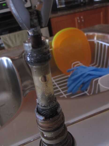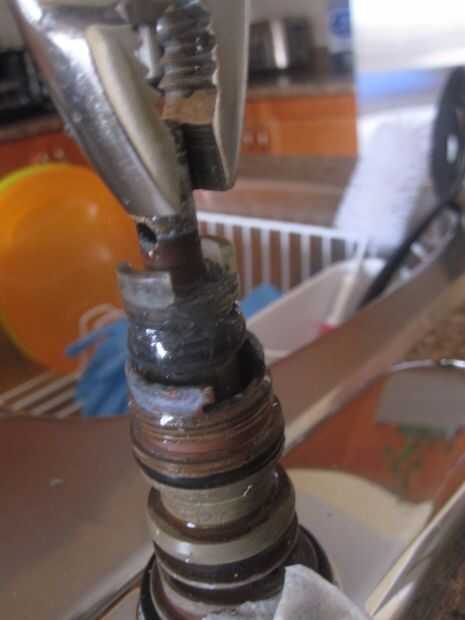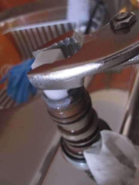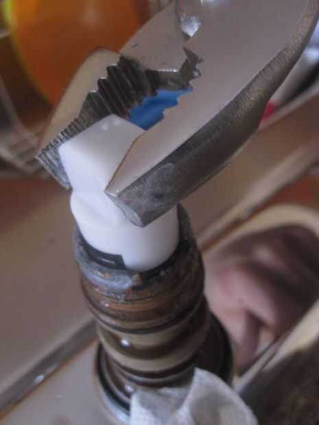 En la caja con el nuevo cartucho se encuentra una pieza de plástico blanco (como se ve en la primera foto) que se desliza sobre el cartucho. Utilice pinzas para girar el cartucho (en cualquier dirección) para aflojarla. No se enrosca en, pero con el tiempo va llegar fundido en lugar haciendo más difícil para tirar hacia arriba y hacia fuera. Una vez Afloje el cartucho por torcer un poco en ambas direcciones, entonces puedes mover para arriba y finalmente extraer el cartucho entero.