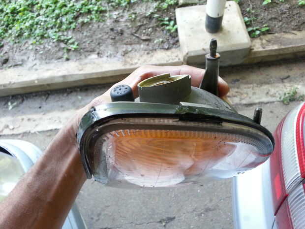 Cualquier daño físico a una Asamblea de la lámpara de plástico puede causar daños. Por suerte aquí el daño no era severo. Un perno de guía de plástico roto dio lugar a un agujero en la luminaria. Limpieza de la luminaria entera para quitar a suciedad, silicona negra se aplicó para hacer el agua accesorio apretado.