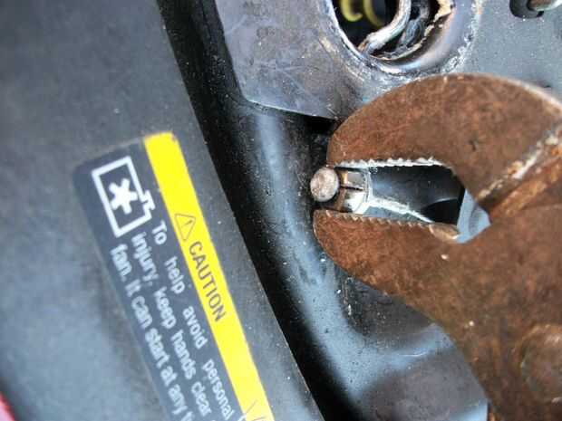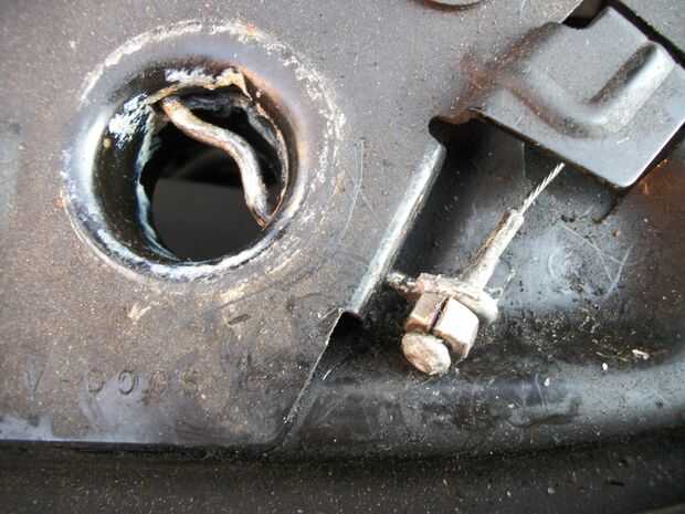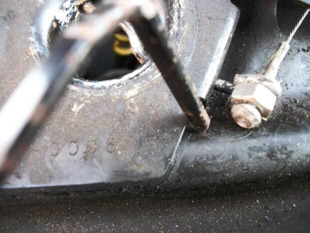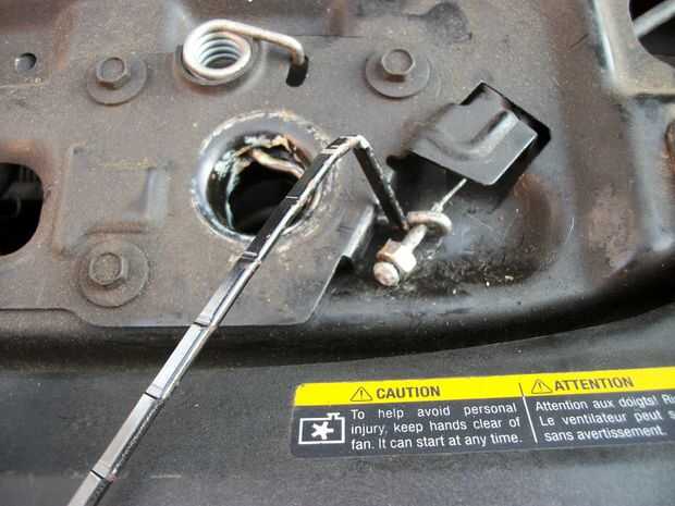 ahora viene la difícil part.you debe "sentir" la varilla que el cable va a y utilizar la plana barra para empujar esta caña lejos de usted. resultados de éxito en un pop.this de campana pueden tomar algún tiempo y una linterna para succeed.on nuestro Saturno, el cable había aparecido fuera el encargado de la loop.if que tuya no, uso las pinzas de la manija en el orificio del pasador de campana para tomar la presión del resorte el cable y deslícelo fuera keeper.slip su tuerca de 5/16 corte sobre cable y tirón hacia el engarzado de plomo al final de la liberación cable.using alicates otra vez , liberar presión del resorte en el encargado de volver a instalar el cable de portero, con la tuerca nueva en el lado de la encrespadura de keeper.use alicates para apretar ranura tuerca cerrada.