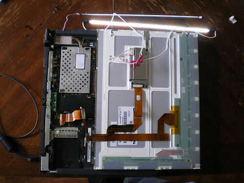 Aunque los detalles de cómo hacerlo varía ampliamente, debe completamente quitar el montaje del LCD de la tapa de tu portátil, para que usted pueda obtener en el borde inferior que aloja la lámpara. Sería la única parte de la pantalla que tiene gruesos cables de alta tensión vas a. Se conectará a un circuito inversor blindado, que es a menudo dentro de la computadora portátil sí mismo, pero a veces detrás de la pantalla, como aquí.
