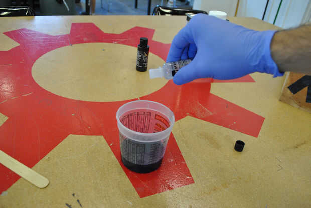 prefiero jet negro para madera replair mayor parte del trabajo. Tengo dada arriba tratando de igualar colores de madera cuando disfrazando un crack. De madera oscura un relleno negro no destacan mucho, y en madera ligera puede mirar como la figuración de ébano blanco o helado de capuchino. Se trata de mi pieza, no me juzgues. Pigmentos especializados están disponibles para la resina, aunque he encontrado casi ningún negro colorear obras. Aquí estoy usando pintura de aerógrafo negro. Un poco de va un largo camino.