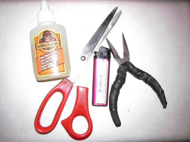 Corte las secciones obviamente malas con unas tijeras y empujó la punta cerrada de alicates de punta en un extremo. Con la llama de un encendedor de butano, suavizó la sección con la punta de los alicates en él y abrió las pinzas abrir un poco para estirar el extremo de la manguera. Después asegurándose de que la apertura fue suficiente para meter el otro lado del corte en, me unta una capa delgada de pegamento del gorila en la pieza que va dentro y trenzados entre sí, asegurándose de que las piezas curvas en la misma dirección que antes del corte.