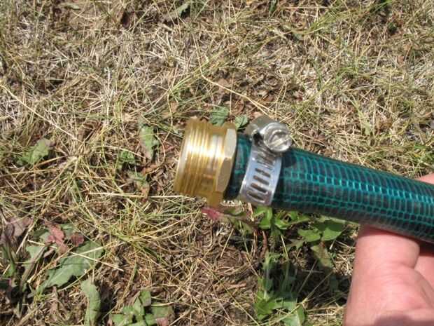 Inserte el extremo macho nuevo en la manguera. Usted debe ser capaz de empujar el extremo nuevo en la manguera con la mano. Una vez que todo el camino, sujete con la abrazadera de la manguera. El nuevo extremo debe permanecer en el lugar sin la pinza. Por lo menos hasta que la presión detrás de él. Si cae al final nuevo, tienes la pieza de tamaño incorrecto o la manguera está peor pensaste.