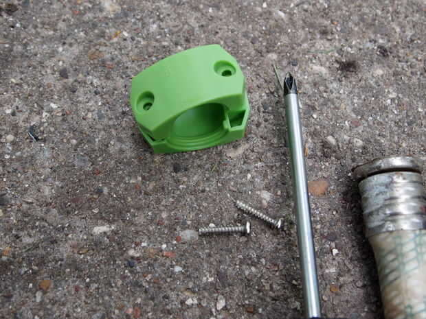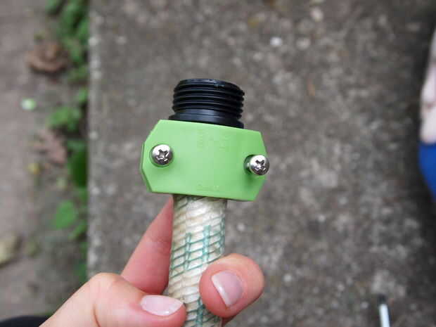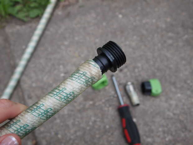 Tomar las piezas de plástico verdes y bloquearla con la manguera y apriete los tornillos. A continuación, añada una nueva arandela en si es necesario y listo! ¡ ¡ Todo solucionado! Ahora no es necesario comprar otro manguera!